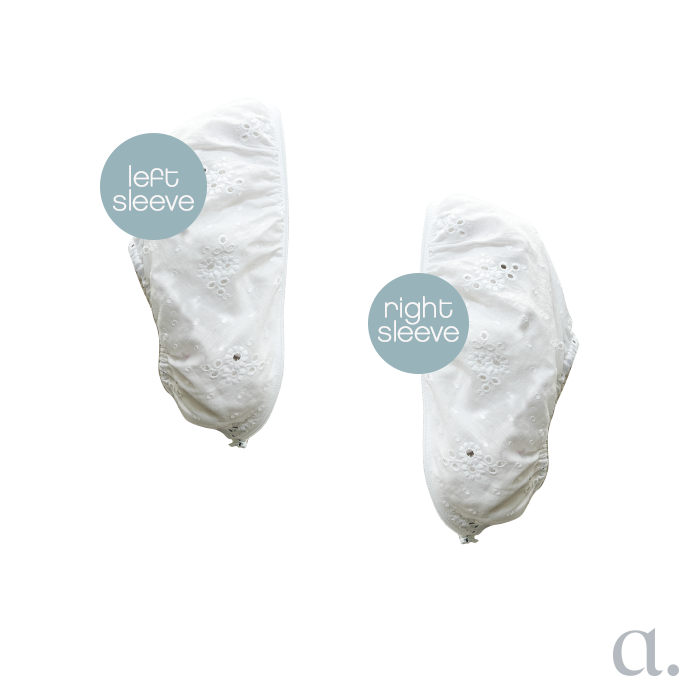 Light, lovely, and effortlessly feminine - our capped Brigitte sleeves in white eyelet add a soft puff and airy charm to any look. They zip easily onto any ajouts. vest and play beautifully with not just white, but navy, grey, black - you name it.